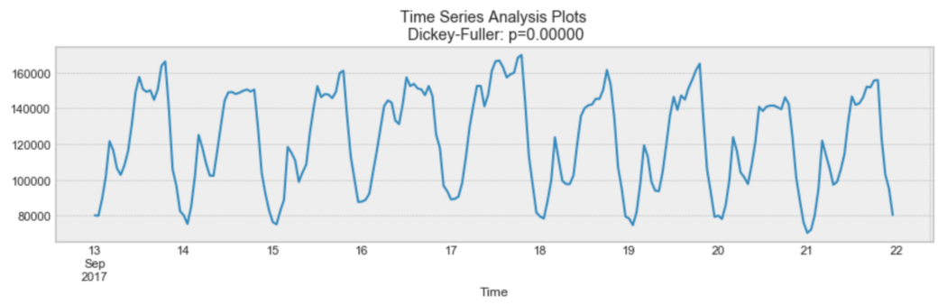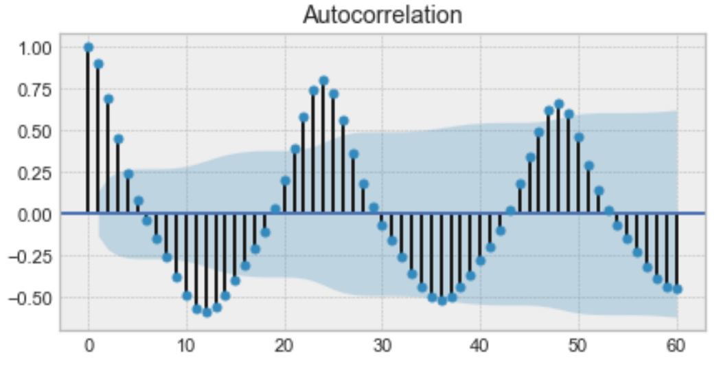 플롯이 사인 함수처럼 생겼는지 확인해봐야 합니다. 이러한 패턴은 시계열의 계절성에 대한 힌트이며 위의 그림에서 일정한 시간 간격으로 반복되는 패턴을 통해서 확인할 수 있습니다.