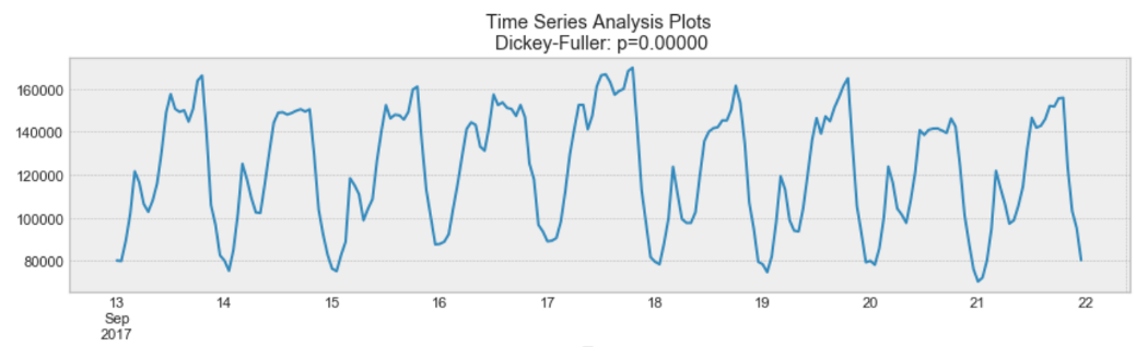 위의 그림에는 명확한 일별 패턴이 있습니다. 매일 저녁 시간에 정점이 되고, 하루가 시작하는 시간과 끝나는 시간이 가장 낮은 지점이 됩니다. 계절성은 사인 곡선 모양인 경우 자기 상관 플롯에서도 파생 될 수 있습니다. 기간을 살펴보면 반복되는 패턴의 길이를 알 수 있습니다.