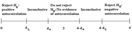 만약 시계열 데이터를 회귀 모형으로 다루고자 한다면 오차항의 자기상관을 여부를 철저하게 검증해야 합니다. 시계열 데이터의 경우 1기전 시기의 오차항(잔차)이 현재시점의 잔차항(오차)에 많은 영향을 미치기 때문에, 가성회귀(Supirous Regression)을 초래할 수 있습니다. 오차항의 독립성은 Durbin-Watson (DW) 통계량이 2 근처의 값이 나오는지 여부로 확인할 수 있습니다. DW 통계량은 보통 d 로 표시하며 0에서 4의 값을 갖습니다.
