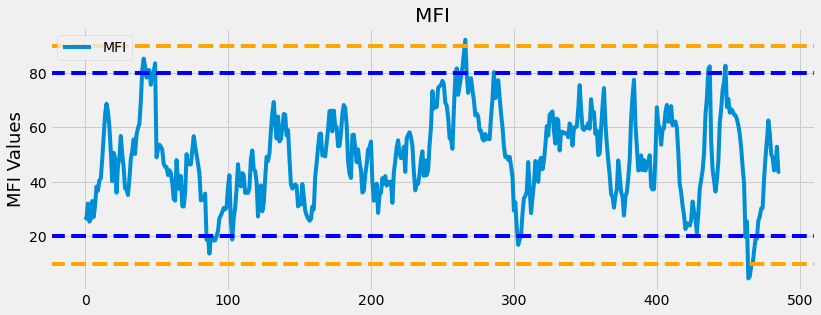 MFI 값이 80 이상이면 과매수(매도 타이밍)로 간주되고, 20 미만이면 과매도(매수 타이밍)로 간주됩니다. 또한 MFI값이 90 또는 10인 경우를 임계값 이라고 합니다.