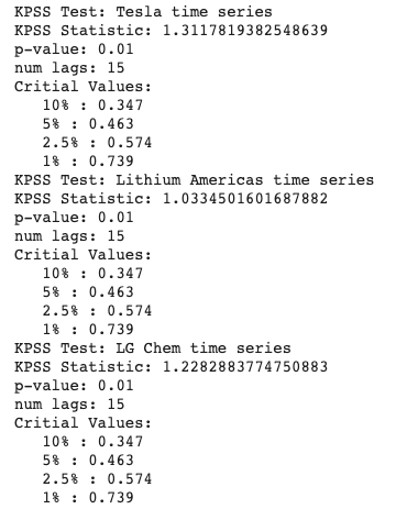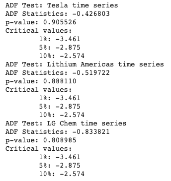 p-value>0.05 이므로 귀무 가설을 기각 할 수 없습니다. 따라서 세 개의 시계열은 안정적이지 않습니다.