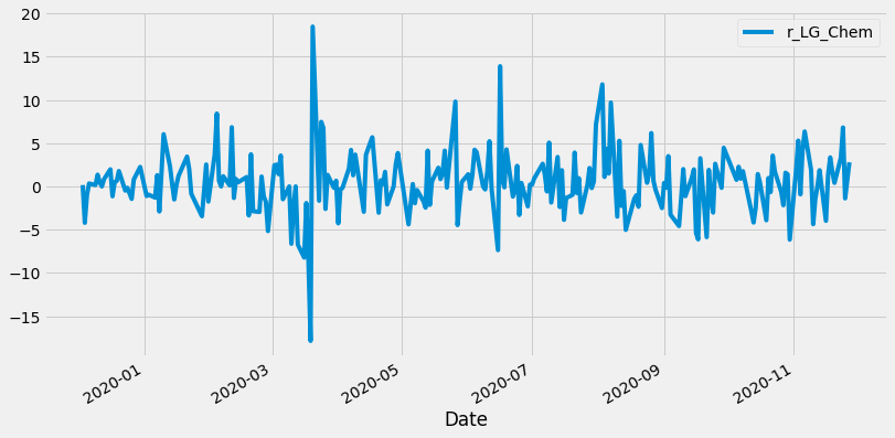 df = pd.merge(df_tsla['Adj Close'], df_lg['Adj Close'], left_index=True, right_index=True, how='left').rename(columns = {'Adj Close_x':'TSLA', 'Adj Close_y':'LG'})