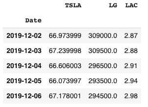 df = pd.merge(df, df_lac['Adj Close'], left_index=True, right_index=True, how='left').rename(columns = {'Adj Close':'LAC'})