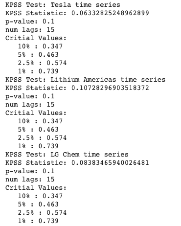 변화율에 대한 KPSS 테스트에서는 세 개의 시계열 모두 p-value가 0.05보다 큰 값을 가지므로 귀무 가설을 기각할 수 없으며 안정적이라고 할 수 있습니다.