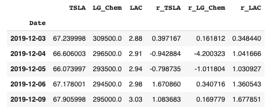 df = pd.merge(df_tsla['Adj Close'], df_lg['Adj Close'], left_index=True, right_index=True, how='left').rename(columns = {'Adj Close_x':'TSLA', 'Adj Close_y':'LG'})