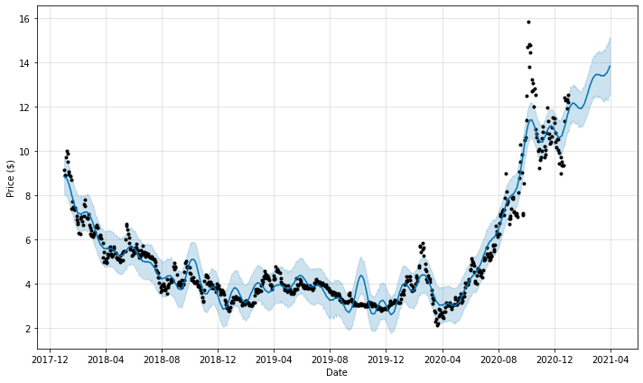 df_prophet.plot(df_forecast, xlabel = 'Date', ylabel = 'Price ($)')