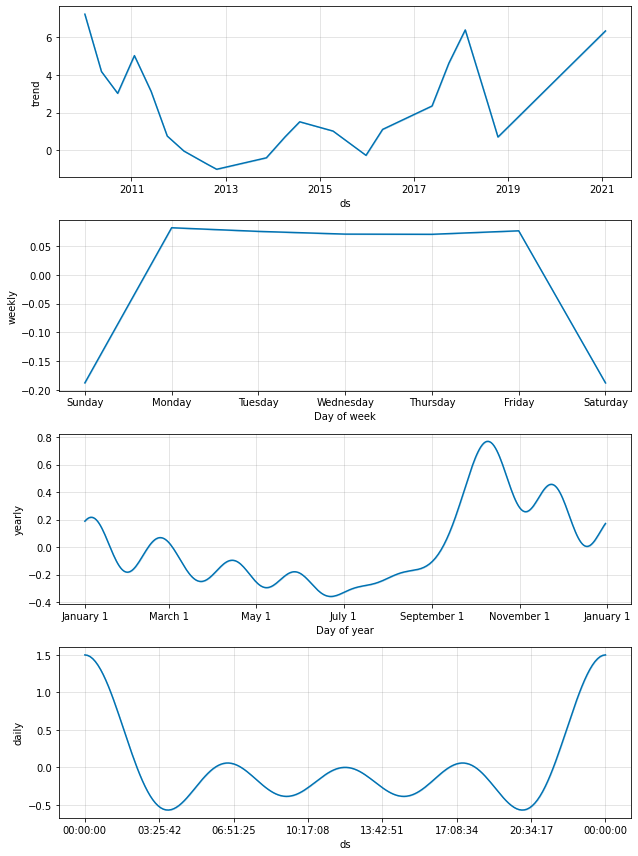 예측에 사용된 구성 요소는 Prophet.plot_components 메서드를 사용해서 확인할 수 있습니다. 기본적으로 시계열의 추세, 연간 계절성, 그리고 주간 계절성이 표시됩니다.