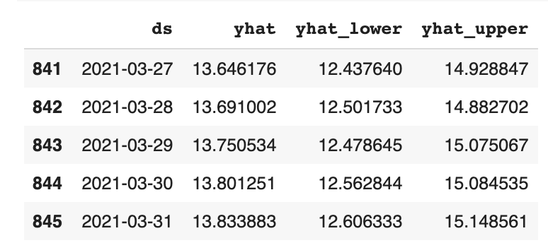 df_forecast[['ds', 'yhat', 'yhat_lower', 'yhat_upper']].tail()
