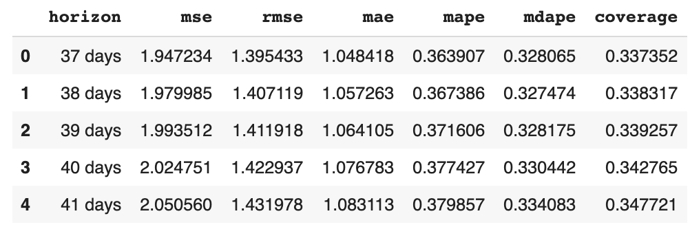 performance_metrics 유틸리티는 컷오프로부터의 거리(예측이 얼마나 빗나갔는지)의 함수로 예측 성능 (y에 비해 yhat, yhat_lower 및 yhat_upper)의 유용한 통계를 계산하는 데 사용할 수 있습니다. 계산된 통계는 평균 제곱 오차(MSE), 제곱 평균 오차(RMSE), 평균 절대 오차(MAE), 평균 절대 백분율 오차(MAPE), yhat_lower 및 yhat_upper 추정치의 범위입니다.