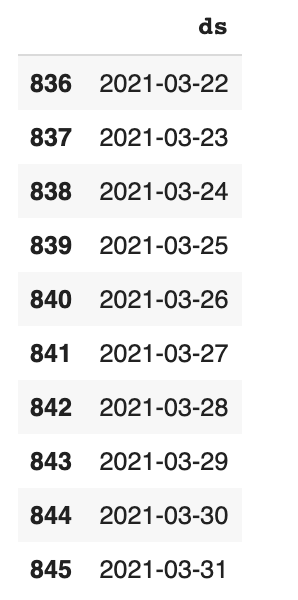 df_forecast = df_prophet.make_future_dataframe(periods = fcast_time, freq = 'D')