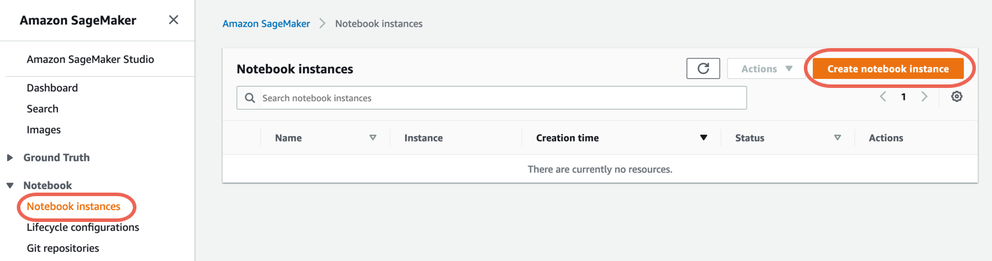 - 노트북 인스턴스를 클릭한 다음 노트북 인스턴스 생성을 선택