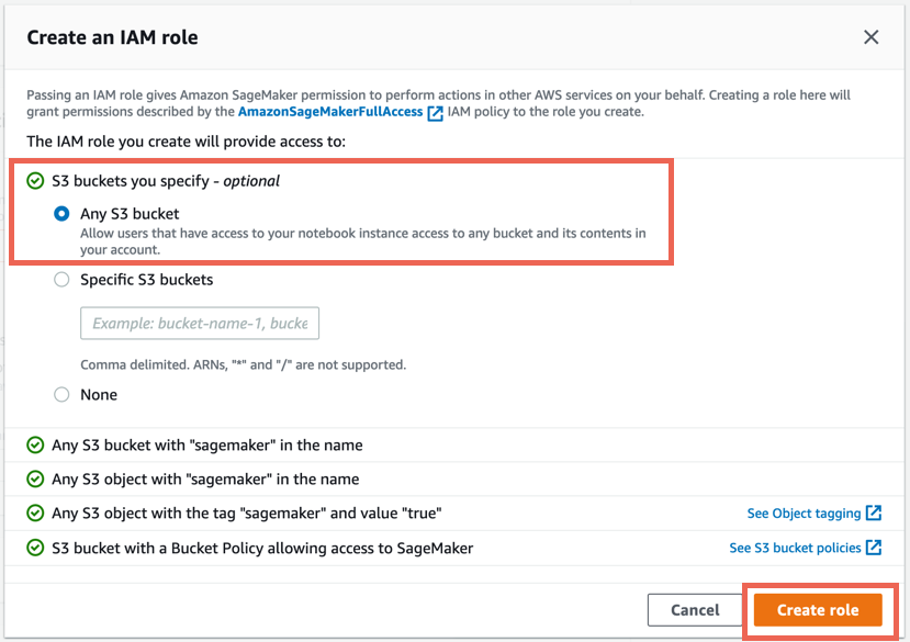 간단히 말해 SageMaker 및 S3 버킷은 AWS에서 제공하는 서비스입니다. 노트북 인스턴스에는 모델을 구축하기 위해 S3 버킷에 저장하는 데이터가 필요합니다. 서비스는 AWS의 다른 서비스에 직접 액세스 할 수 없습니다. 따라서 노트북 인스턴스가 S3 버킷의 데이터에 액세스 할 수 있도록 역할을 제공해야합니다. 인스턴스가 작업 할 특정 S3 버킷 또는 모든 S3 버킷을 제공 할 수 있습니다.