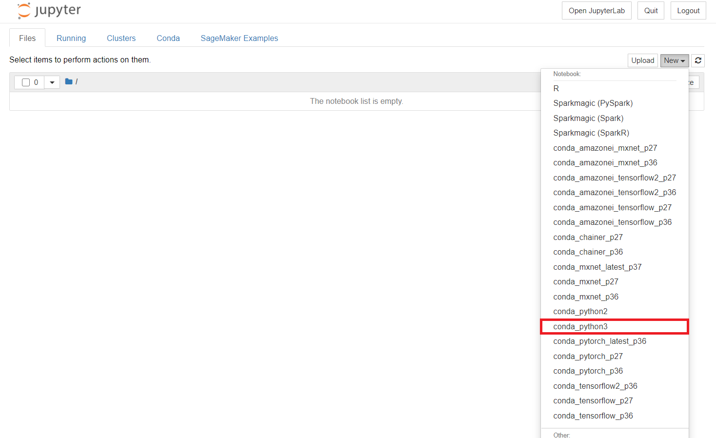 - 인스턴스가 생성되는 데 몇 분 정도 소요됨. jupyter를 클릭 한 후 작업 할 노트북 환경을 선택