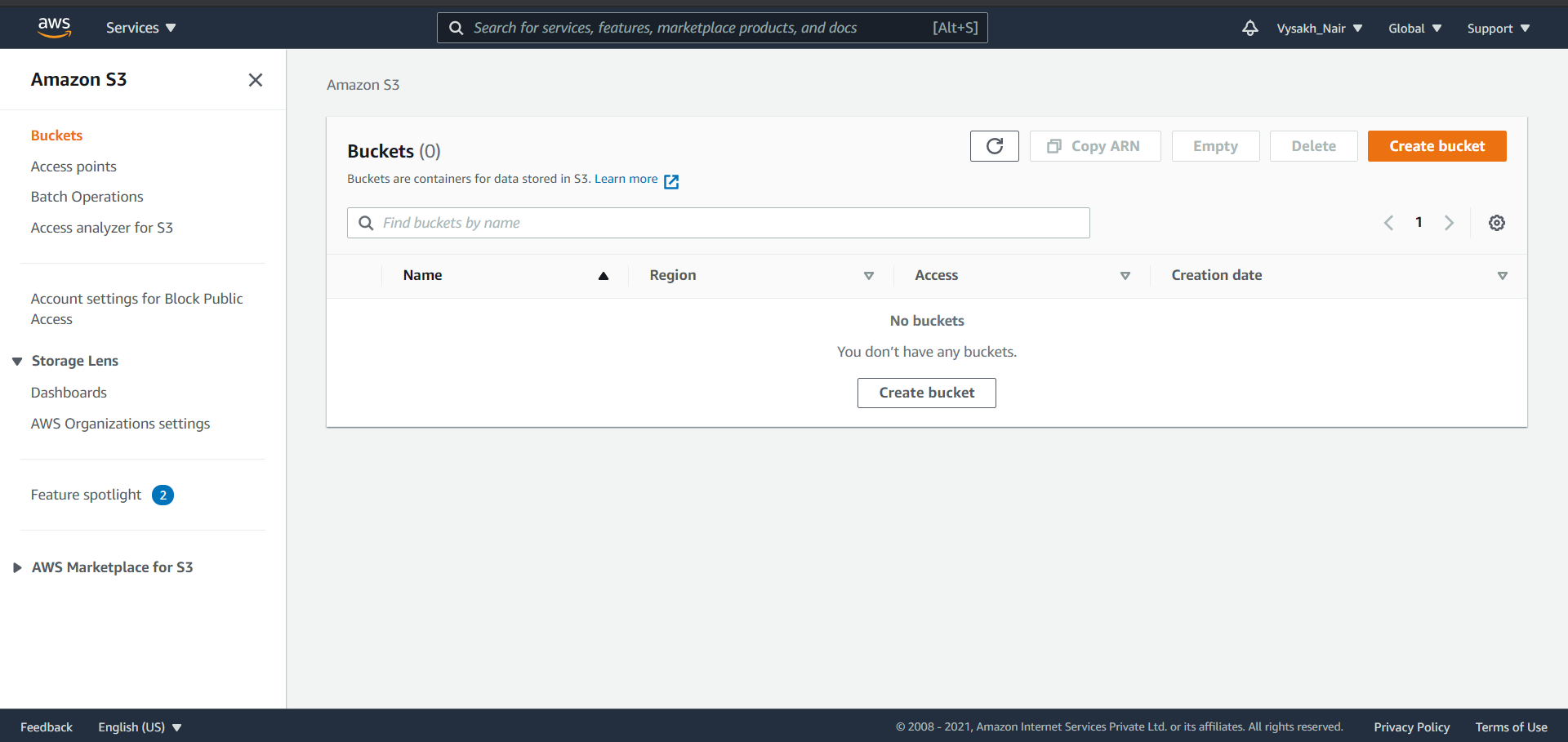 S3 버킷은 수동으로 생성하거나 boto3를 사용하여 노트북 인스턴스에서 생성 할 수 있습니다. 이 튜토리얼에서는 boto3를 사용하여 하나를 생성해 보겠습니다.