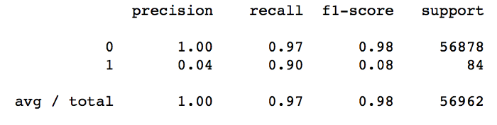 두 클래스를 모두 고려할 때 Precision에 대한 좋은 결과가 있습니다. 그러나 Recall은 사기의 정확도 만큼 좋지 않습니다.