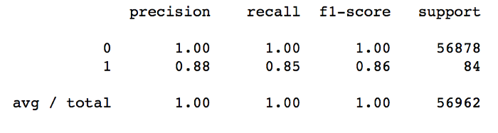 우리 모델은 사기 거래를 예측하기 위해 Random Forests Classifier를 사용합니다. 불균형 데이터 문제를 해결하기 위해 아무것도하지 않고도 우리 모델은 네거티브 클래스 레이블에 대해 100 % 정밀도를 달성 할 수있었습니다.