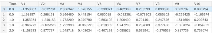 기밀성 때문에 데이터가 익명화되었습니다. 변수 이름은 V1부터 V28까지 V1, V2, V3로 이름이 변경되어 있습니다. 또한 Amount 및 Class 변수를 제외하고 대부분은 스케일링되었으며 Class는 0과 1로 되어 있는 이진 데이터이며, 정상 또는 사기가 표시 되어 있는 대상 변수입니다.