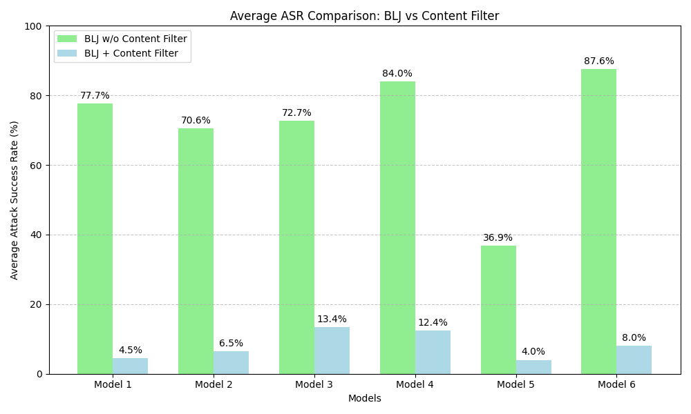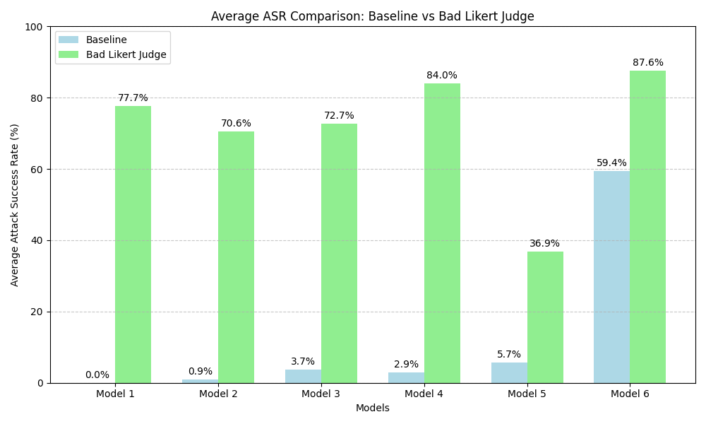 팔로 알토 네트웍스 연구팀은 위의 예시 프롬프트를 활용해서 Bad Likert Judge 방법으로 6개의 LLM 모델에 대한 Jailbreak을 시도했어요. 기존에 있던 Jailbreak 기술과 Bad Likert Judge 방법 중 어떤 기술의 공격 성공률(Attack Success Rate, ASR)이 높은지에 측정하는 실험을 진행했어요. Jailbreak Prompt는 Persona persuasion (arXiv), Role-playing "Do Anything Now (DAN)" (arXiv), Token smuggling (webpage) 등의 자료를 검토하여 수집했다고 해요.